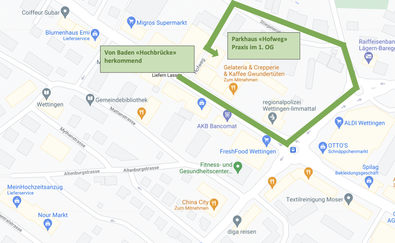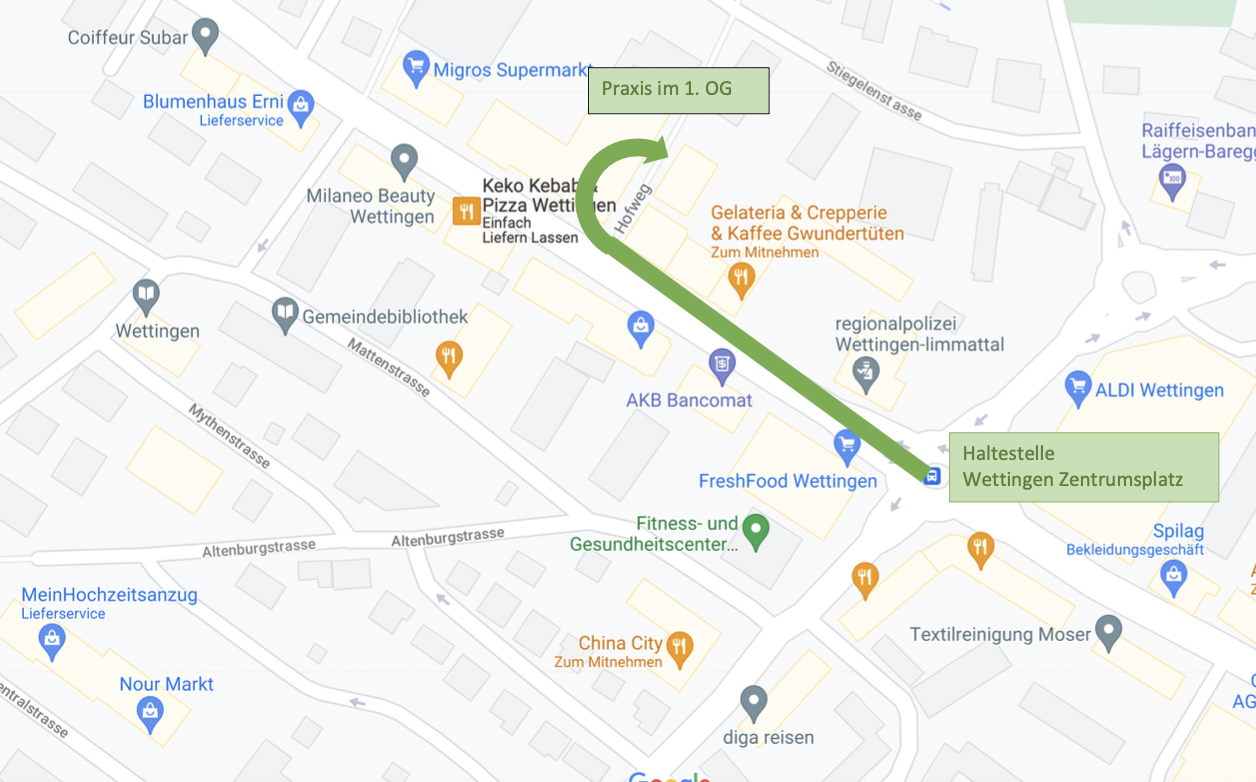 Sie Haltestelle "Wettingen, Zentrumsplatz" ist wenige Gehminuten von der Praxis entfernt.